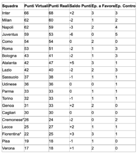 In questo scenario virtuale, l’Inter resterebbe comunque in testa alla classifica, ma con un bottino ridotto a 66 punti rispetto ai 68 attuali. Alle sue spalle si troverebbero Milan e Napoli, appaiate a quota 62, a testimonianza di un equilibrio ancora più marcato nella lotta per le posizioni di vertice.